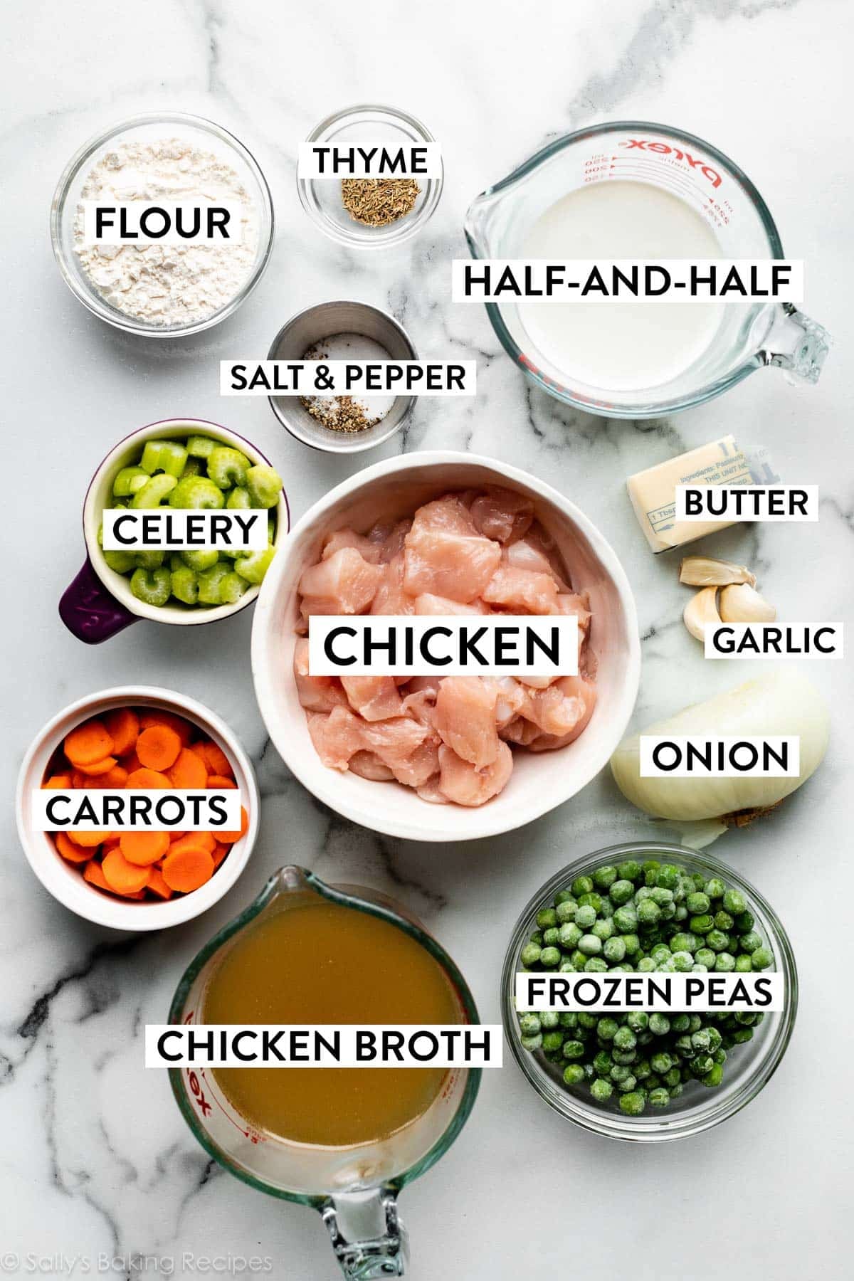 - Seasonings: We’re flavoring this pot pie filling with salt, pepper, and thyme.