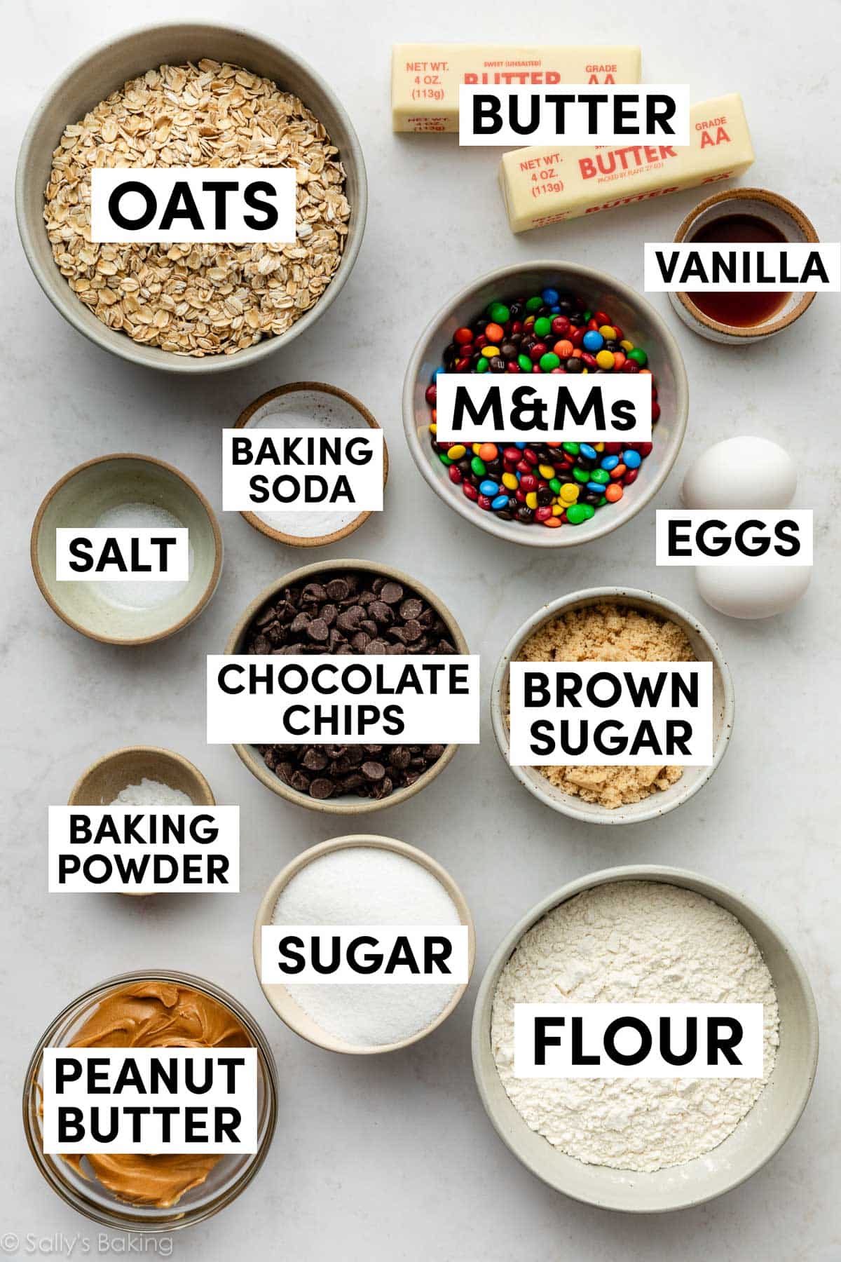 - Texture: Packed with delicious add-ins, these cookies have soft and chewy centers and a delightful mix of textures from wholesome oats and crunchy mini M&Ms. With more oats than flour—more so than my smaller, thick monster cookies—expect a heartier, chewier bite throughout.