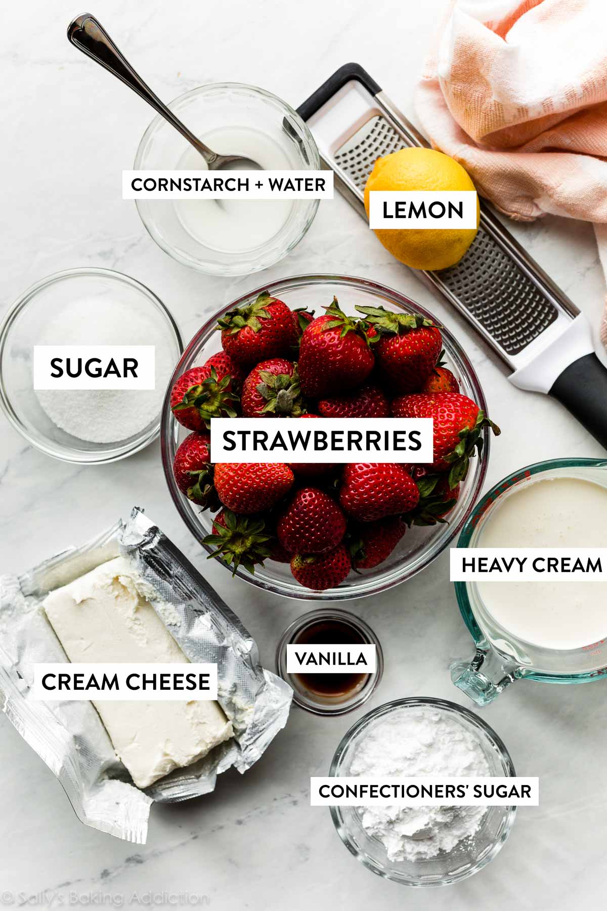 1. Make the strawberry topping first so it can cool: Chop some of the strawberries until you have 1 cup, or 150–160 grams/5.5 ounces. Quarter the remaining strawberries (you should end up with about 3.5 cups, or about 500 grams/18 ounces, of quartered strawberries) and set aside until step 5. Lightly mash the chopped strawberries with a pastry cutter, potato masher, or a fork. Using a fork, mix the cornstarch and water together in a small bowl until the cornstarch has dissolved. Warm the mashed strawberries, cornstarch mixture, and sugar together in a small saucepan over medium heat. Cook until boiling, stirring often. Mixture will be cloudy. Boil 1 minute or until it’s thick like a jam (no longer liquid-y). Remove from heat, stir in the lemon zest, and cool completely. (Must completely cool, so transferring to a bowl out of the saucepan helps speed that up. Feel free to refrigerate it. You can complete a few other steps in the recipe as the mixture cools.)